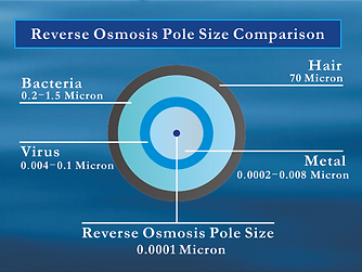 RO membrane pore size is 0.0001 micron only, which is 5,000 times smaller than ordinary filtration filter (0.5 micron)